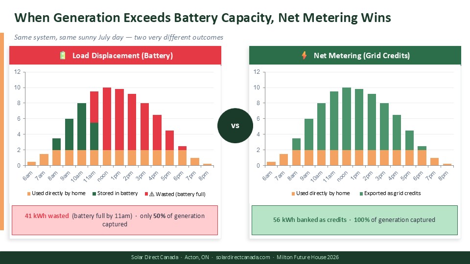 Send 56 kWh to the grid on a summer day. Draw back the equivalent of 84 kWh in purchasing power. The grid doesn’t degrade, doesn’t need replacing, and has unlimited capacity. Under Ontario Regulation 541/05, you have a 12-month rolling window to use your credits — a well-sized system draws them down comfortably over winter.
