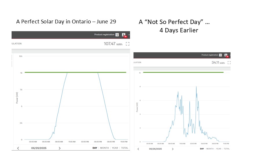 Two days in late June from the same 10 kW system: June 29 produced 107 kWh on a clear day; four days earlier, clouds cut output to 34 kWh. Net metering handles both equally well — every kWh generated is captured, whatever the weather.
